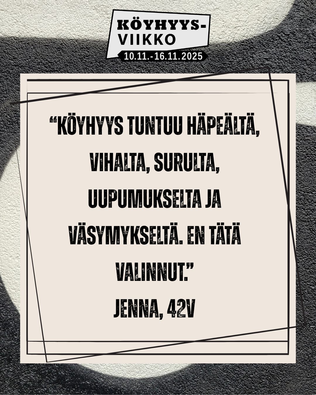 Olemme koonneet kansion some materiaalia, jota voi vapaasti jakaa ja käyttää omissa tiedotuskanavissa. Materiaalin köyhyyskokemukset on poimittu Suomen köyhyyden vastaisen verkoston EAPN-Finin ja Kuka kuuntelee köyhää? -verkoston keväällä 2025 tekemän verkkokyselyn avovastauksista. Voit myös tehdä materiaalia itse lisää käyttämällä somepohjaa ja lisäämällä oman tekstin.